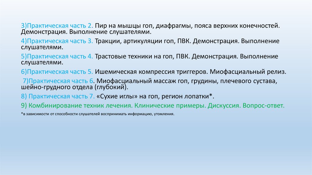 3)Практическая часть 2. Пир на мышцы гоп, диафрагмы, пояса верхних конечностей.Демонстрация. Выполнение слушателями.