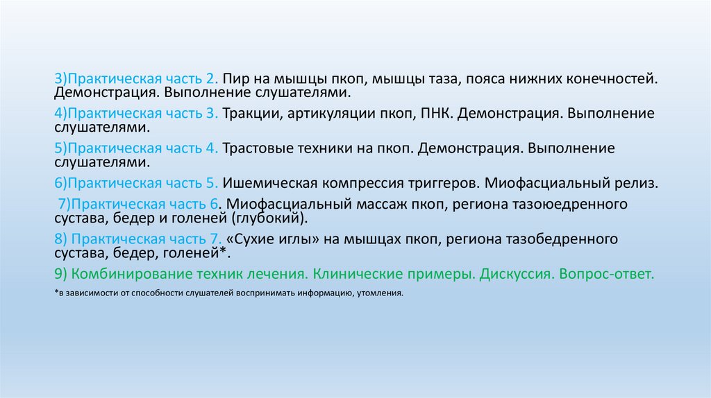 3)Практическая часть 2. Пир на мышцы пкоп, мышцы таза, пояса нижних конечностей.Демонстрация. Выполнение слушателями.