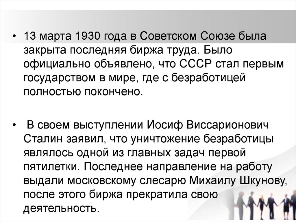 • 13 марта 1930 года в Советском Союзе былазакрыта последняя биржа труда. Было