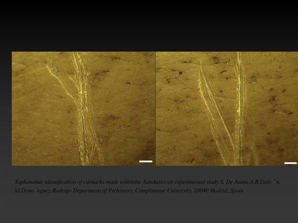 Taphonomic identification of cutmarks made withlithic handaxes:an experimental study S. De Juana,A.B.Gala ´ n,M.Domı´nguez-Rodrigo Department of Prehistory, Complutense University, 28040 Madrid, Spain
