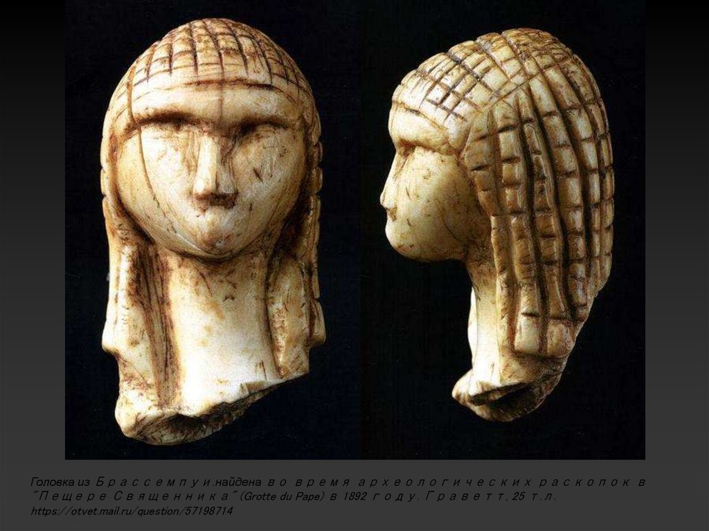 Головка из Брассемпуи.найдена во время археологических раскопок в"Пещере Священника" (Grotte du Pape) в 1892 году. Граветт, 25 т.л.