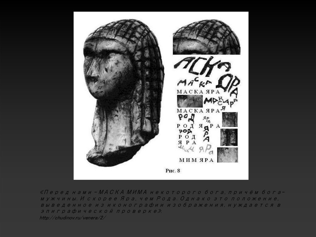 «Перед нами - МАСКА МИМА некоторого бога, причём богамужчины. И скорее Яра, чем Рода. Однако это положение,выведенное из иконографии изображения, нуждается в