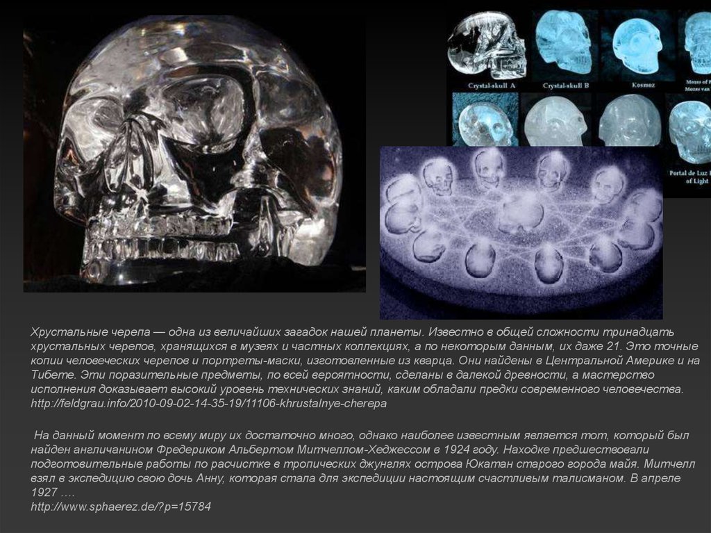 Хрустальные черепа — одна из величайших загадок нашей планеты. Известно в общей сложности тринадцатьхрустальных черепов, хранящихся в музеях и частных коллекциях, а по некоторым данным, их даже 21. Это точные