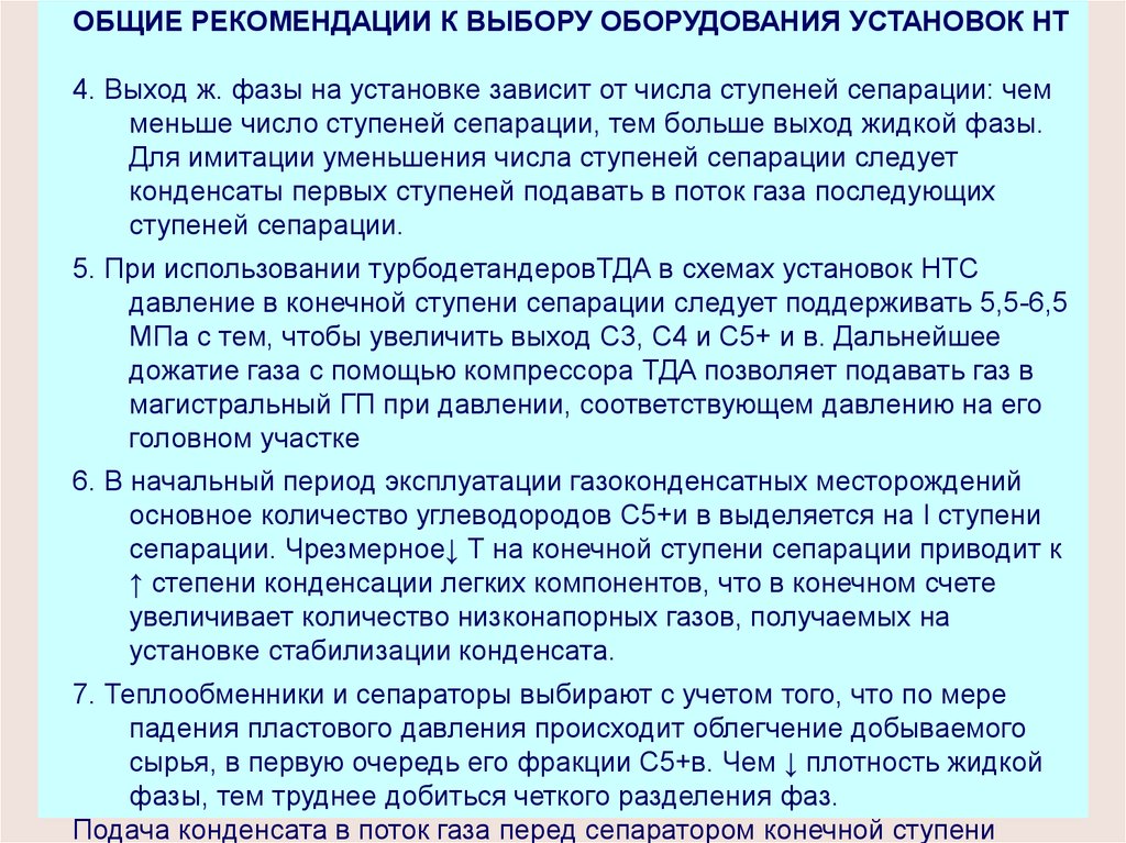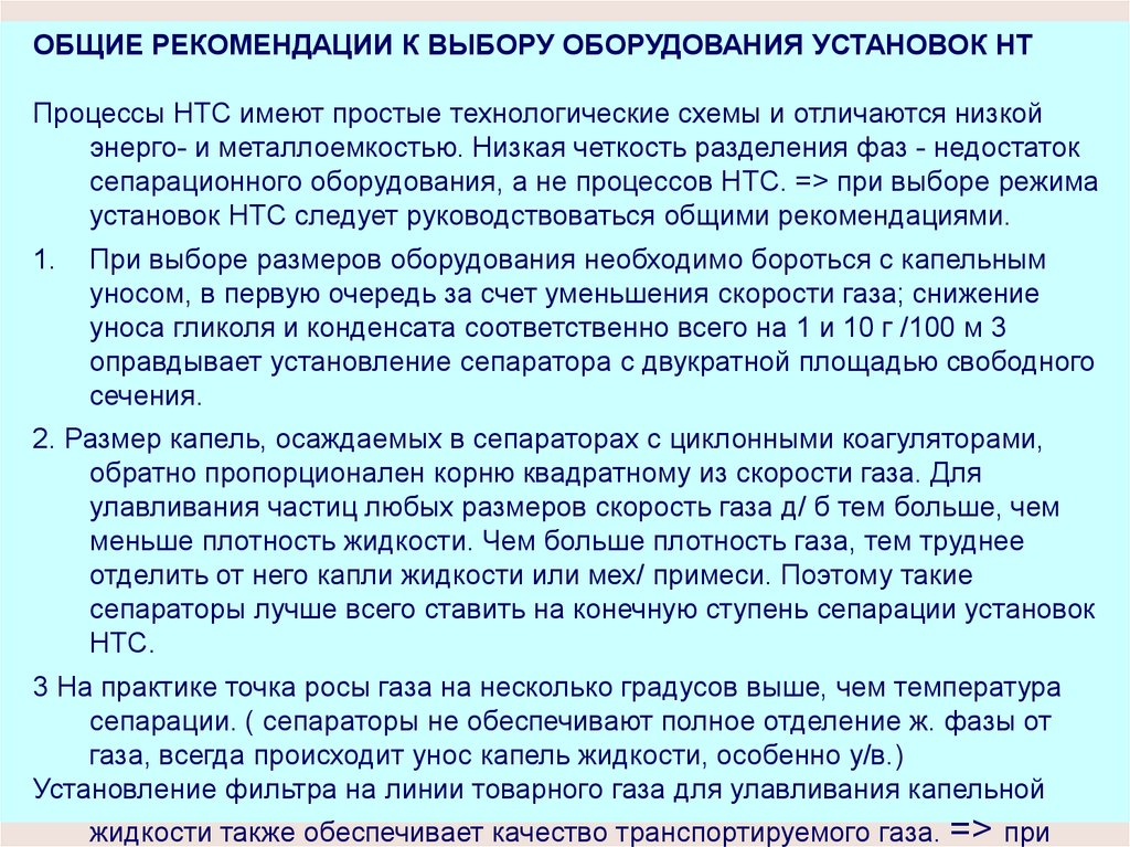 сепарационного оборудования, а не процессов НТС. => при выборе режима