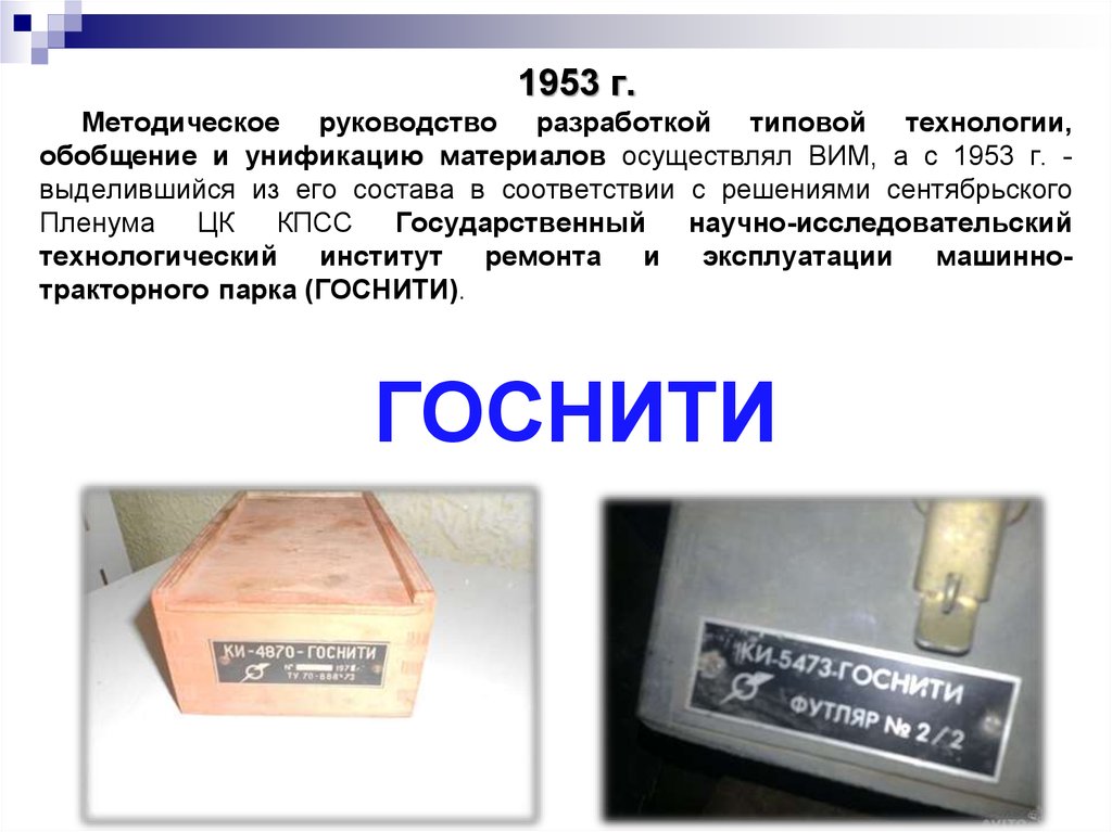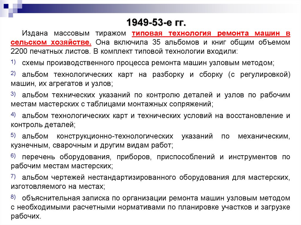 1949-53-е гг.Издана массовым тиражом типовая технология ремонта машин в