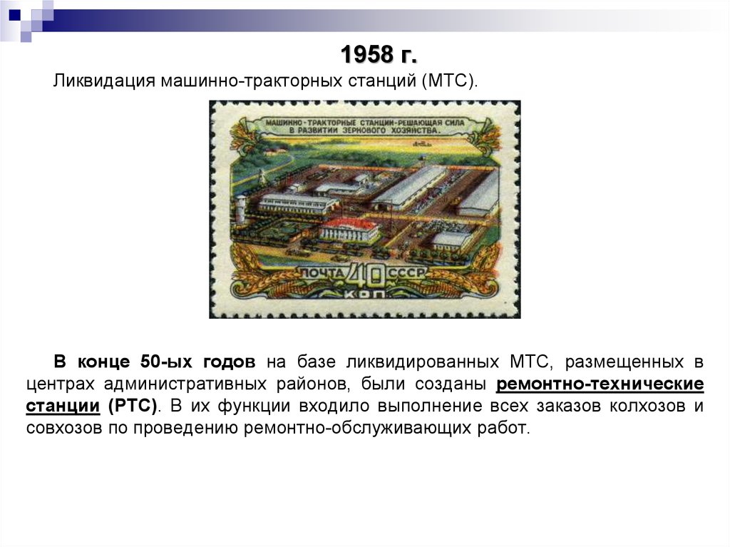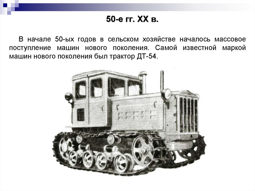 50-е гг. ХХ в.В начале 50-ых годов в сельском хозяйстве началось массовое