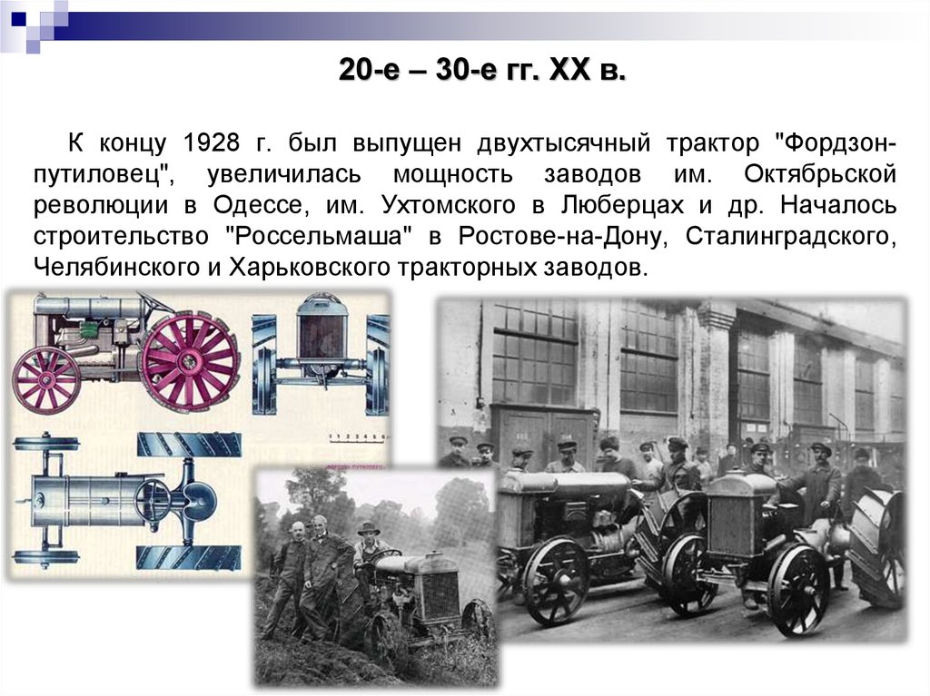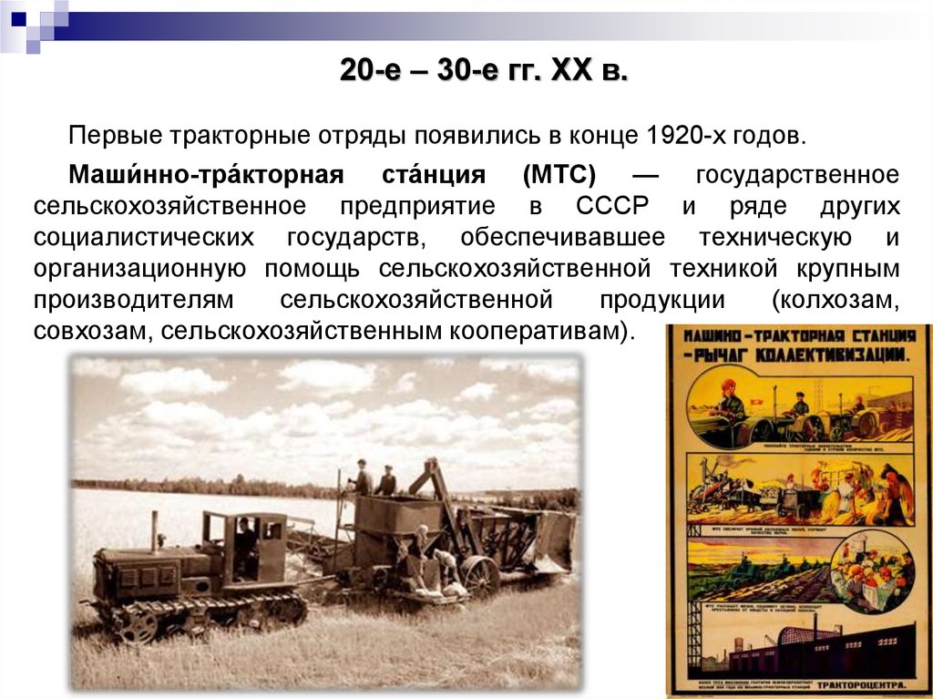20-е – 30-е гг. ХХ в.Первые тракторные отряды появились в конце 1920-х годов.