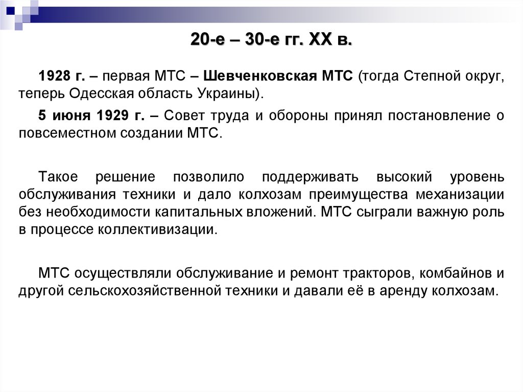 20-е – 30-е гг. ХХ в.1928 г. – первая МТС – Шевченковская МТС (тогда Степной округ,