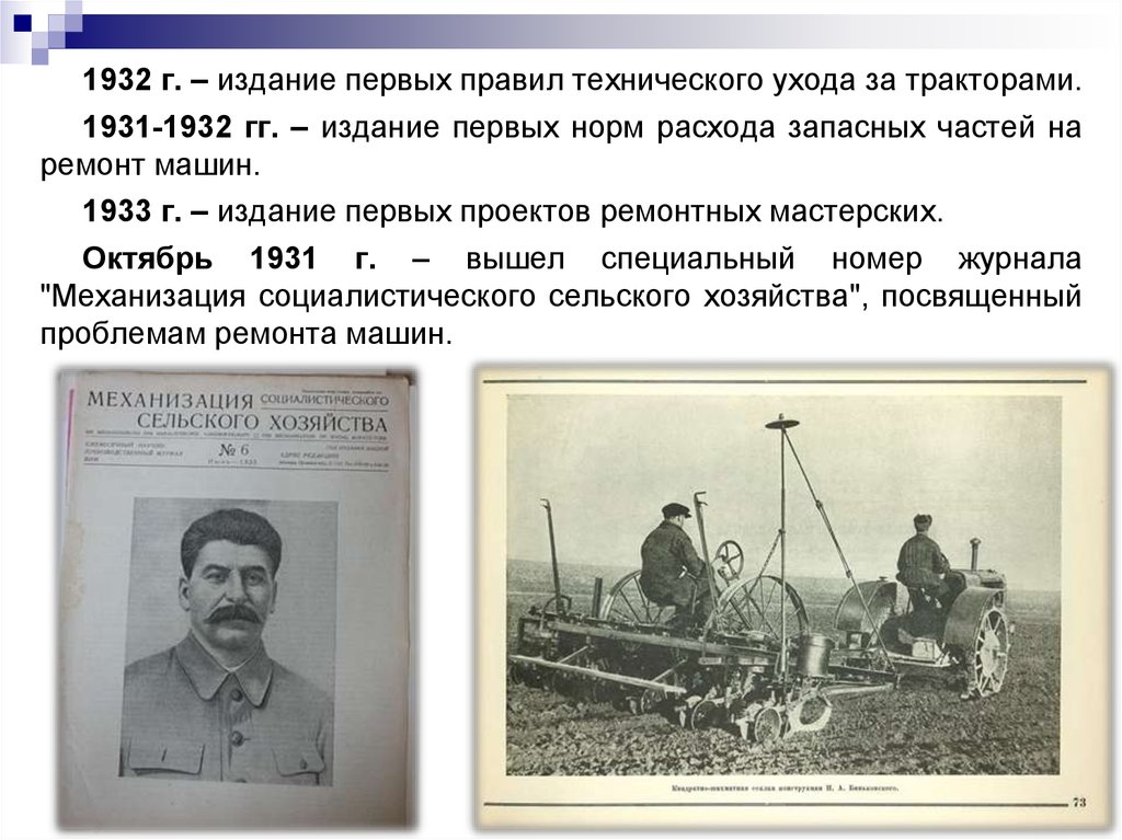 1932 г. – издание первых правил технического ухода за тракторами.1931-1932 гг. – издание первых норм расхода запасных частей на