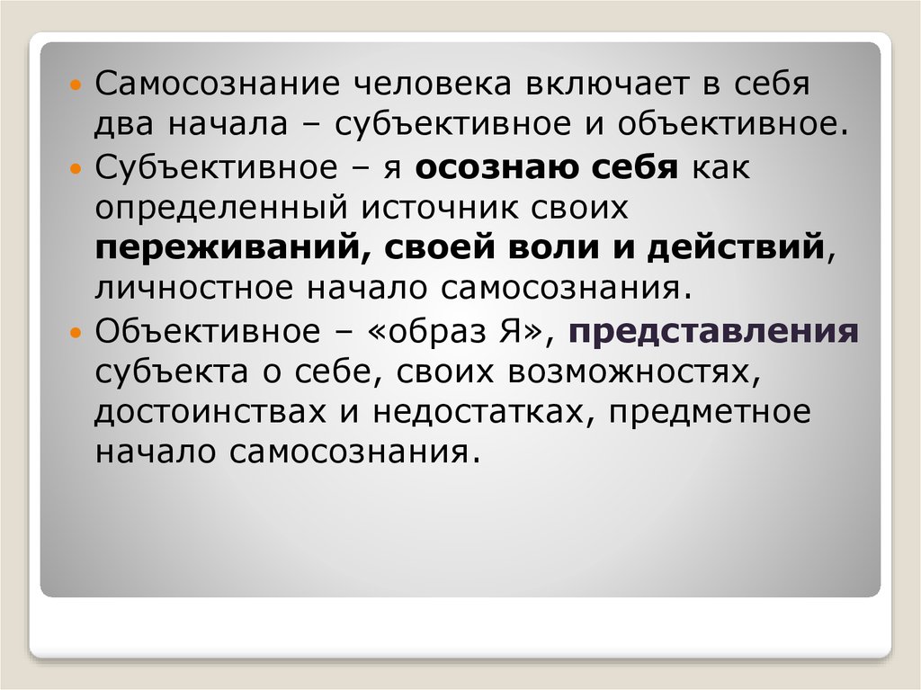 Самосознание человека включает в себядва начала – субъективное и объективное.