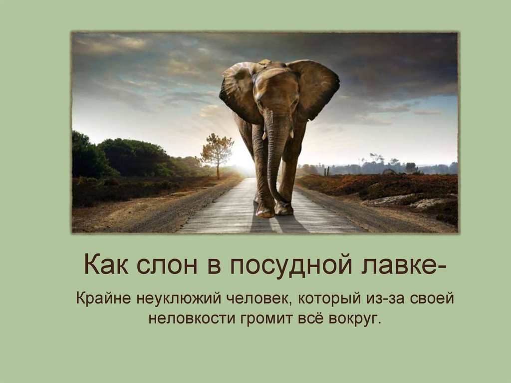 Как слон в посудной лавкеКрайне неуклюжий человек, который из-за своейнеловкости громит всё вокруг.