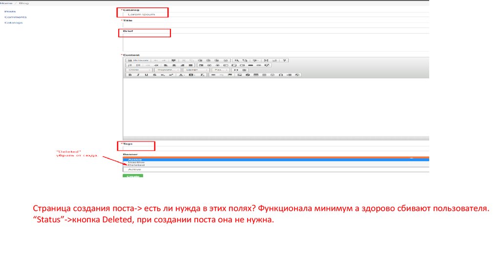 Страница создания поста-> есть ли нужда в этих полях? Функционала минимум а здорово сбивают пользователя.“Status”->кнопка Deleted, при создании поста она не нужна.