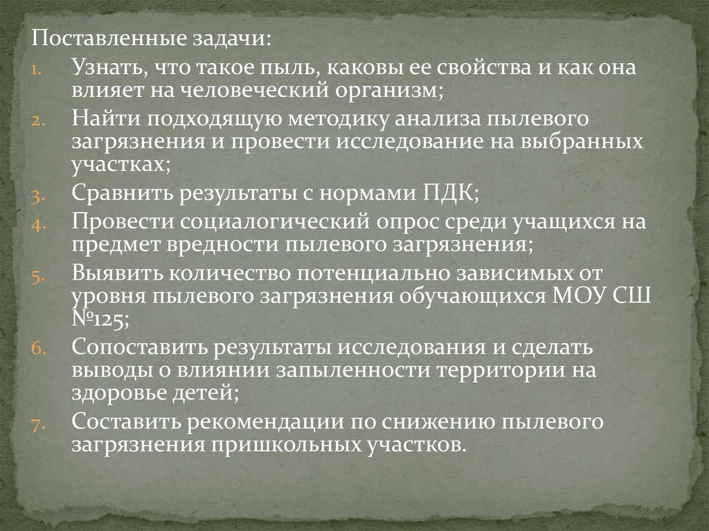 Поставленные задачи:1. Узнать, что такое пыль, каковы ее свойства и как она