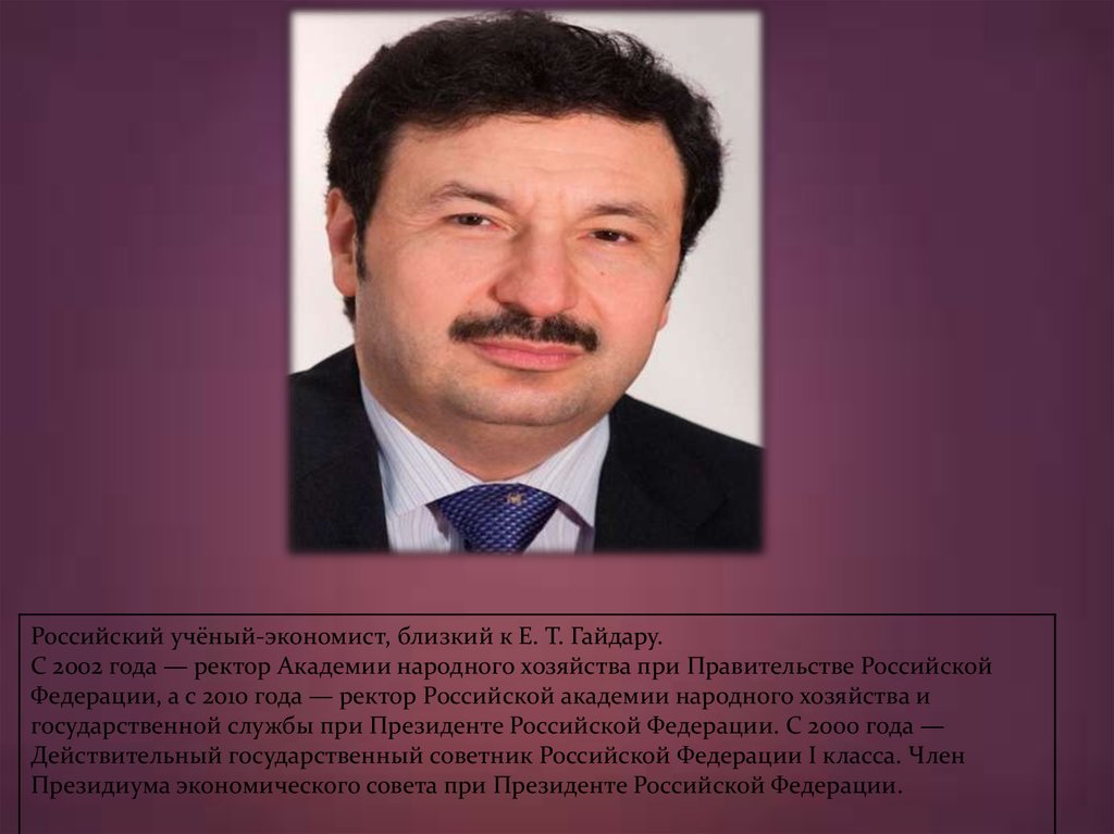 Российский учёный-экономист, близкий к Е. Т. Гайдару.С 2002 года — ректор Академии народного хозяйства при Правительстве Российской