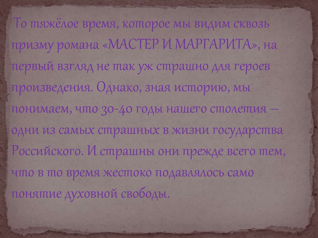 То тяжёлое время, которое мы видим сквозьпризму романа «МАСТЕР И МАРГАРИТА», на