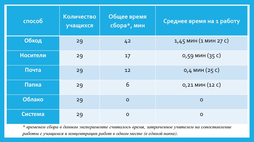 * временем сбора в данном эксперименте считалось время, затраченное учителем на сопоставление