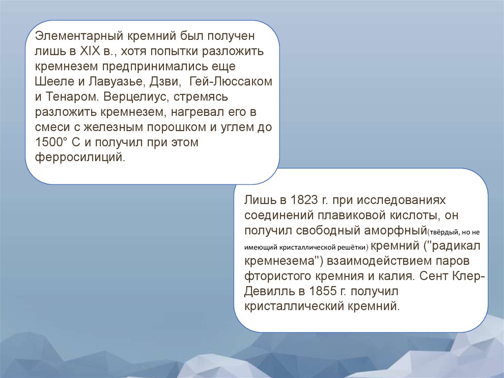 Элементарный кремний был полученлишь в XIX в., хотя попытки разложить