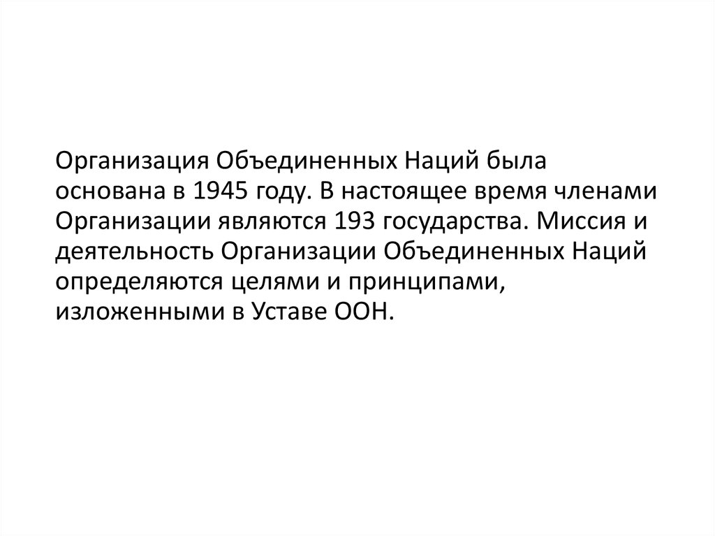 Организация Объединенных Наций былаоснована в 1945 году. В настоящее время членами
