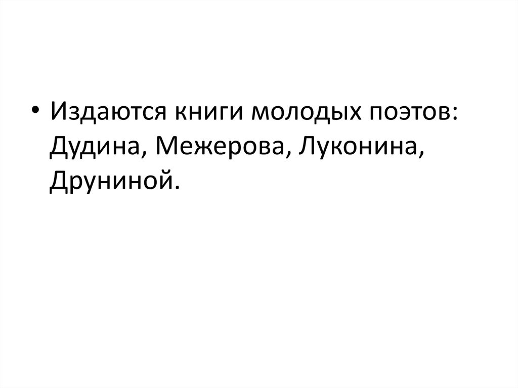 • Издаются книги молодых поэтов:Дудина, Межерова, Луконина,