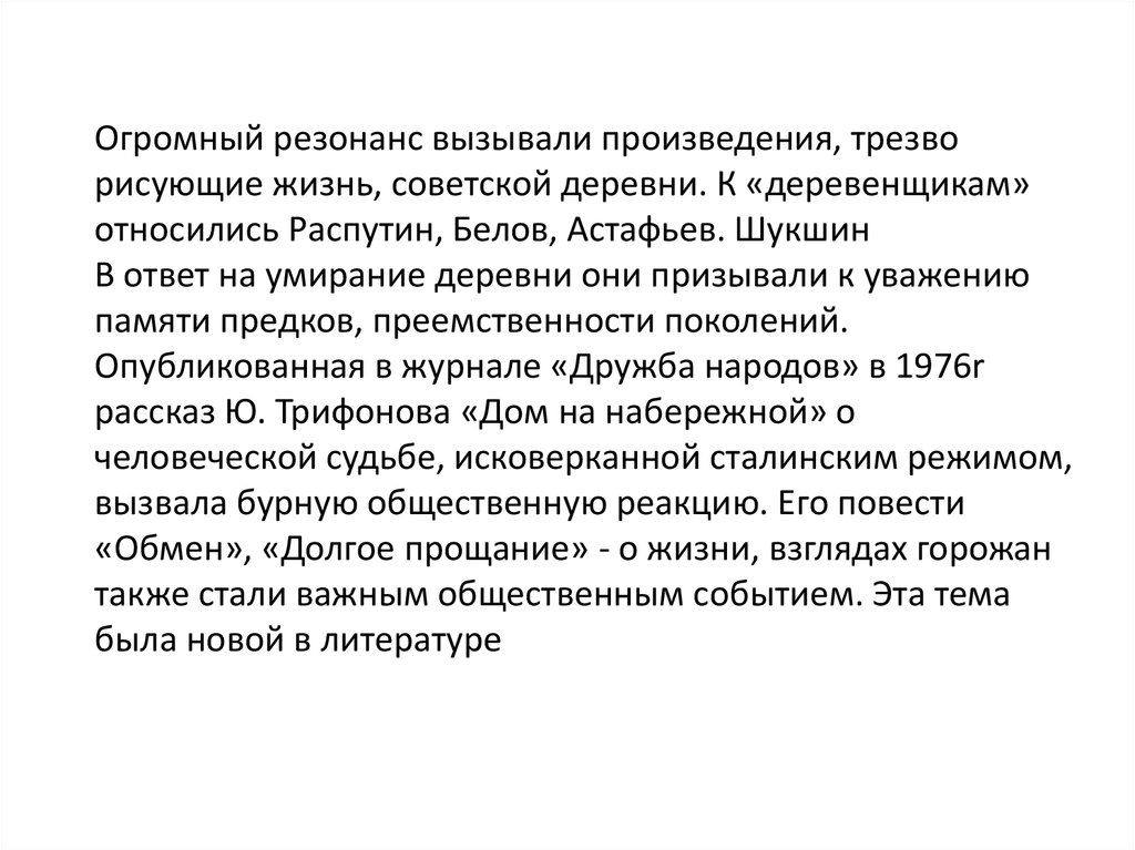 Огромный резонанс вызывали произведения, трезворисующие жизнь, советской деревни. К «деревенщикам»