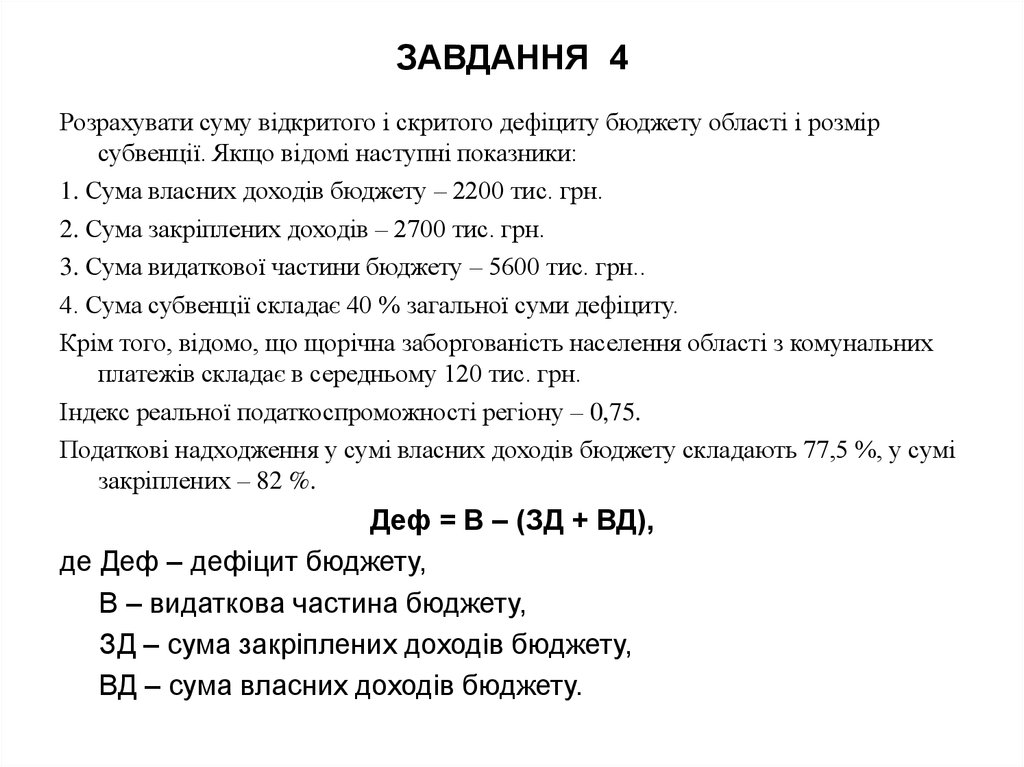ЗАВДАННЯ 4Розрахувати суму відкритого і скритого дефіциту бюджету області і розмір