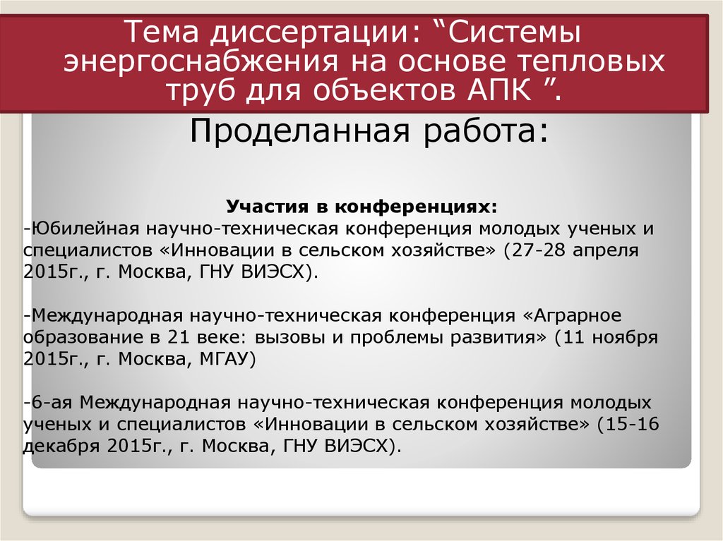 Тема диссертации: “Системыэнергоснабжения на основе тепловых