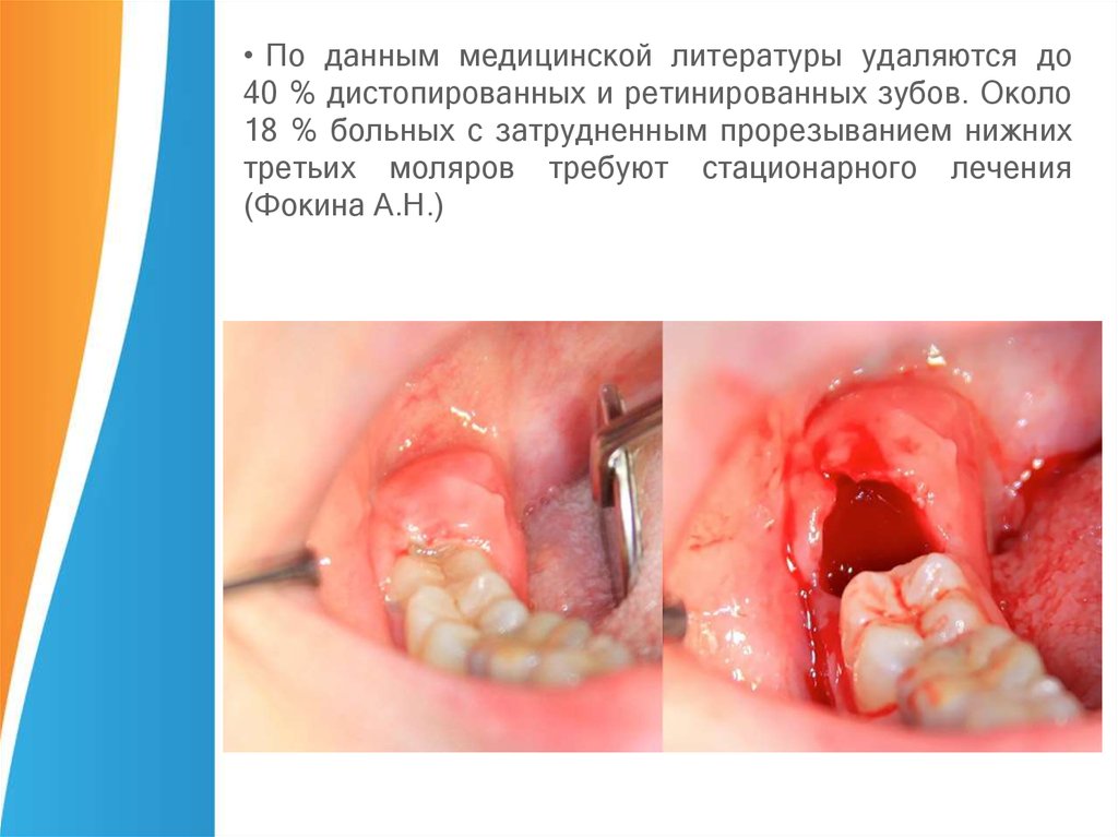 • По данным медицинской литературы удаляются до40 % дистопированных и ретинированных зубов. Около