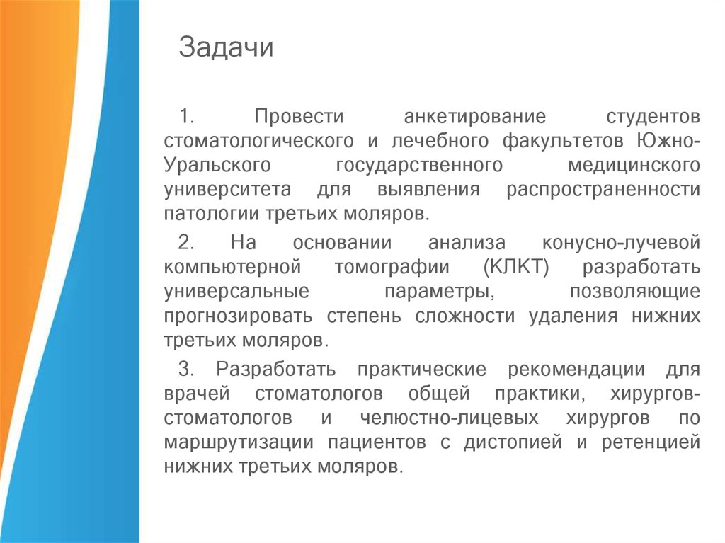 • Дистопия и ретенция третьих моляров нижней челюсти попрежнему остается актуальной проблемой в современнойамбулаторной хирургической стоматологии и челюстнолицевой хирургии. Удаление таких зубов считается сложным