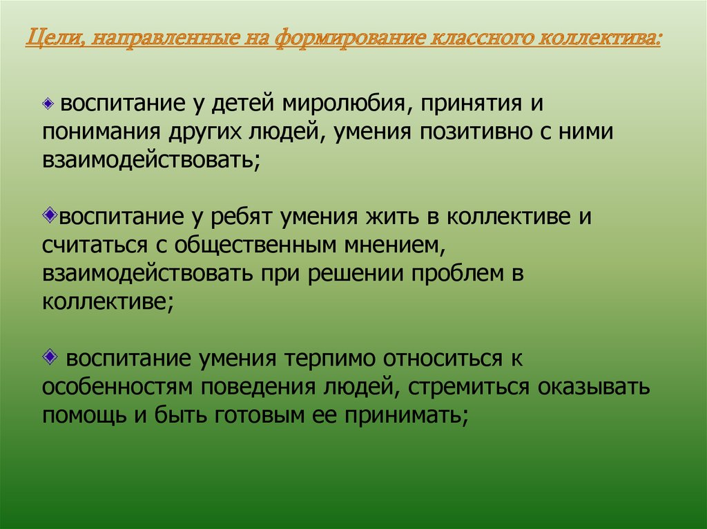 Цели, направленные на формирование классного коллектива:воспитание у детей миролюбия, принятия и