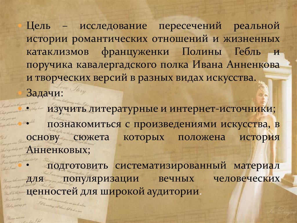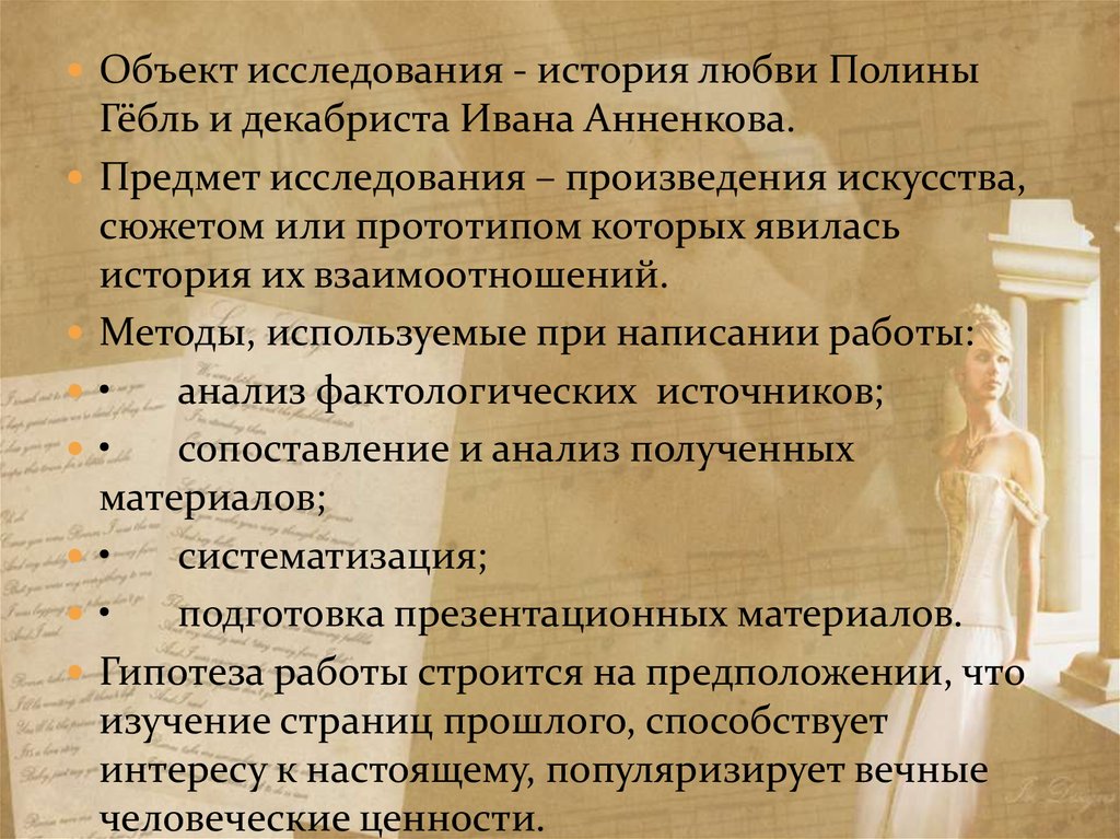 Объект исследования - история любви ПолиныГёбль и декабриста Ивана Анненкова.