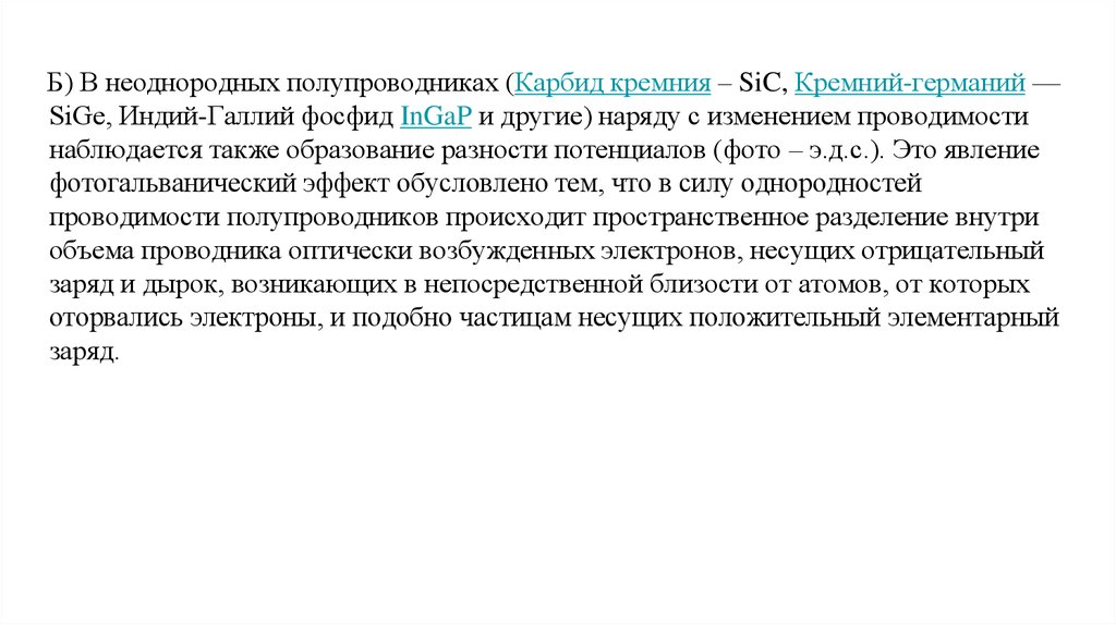 Б) В неоднородных полупроводниках (Карбид кремния – SiC, Кремний-германий —SiGe, Индий-Галлий фосфид InGaP и другие) наряду с изменением проводимости