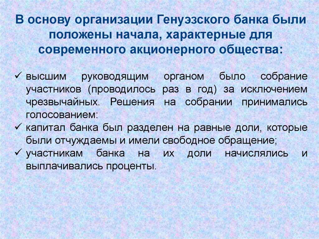 В основу организации Генуэзского банка былиположены начала, характерные для