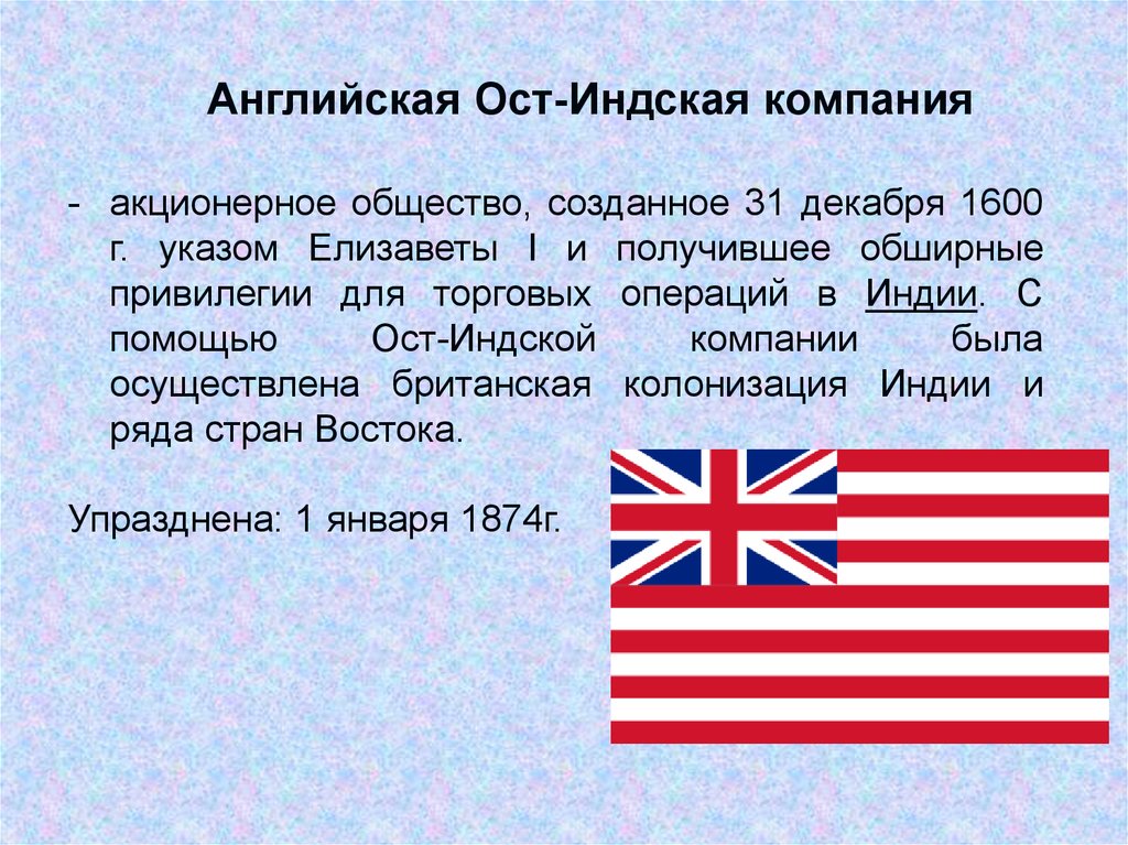 Английская Ост-Индская компания- акционерное общество, созданное 31 декабря 1600