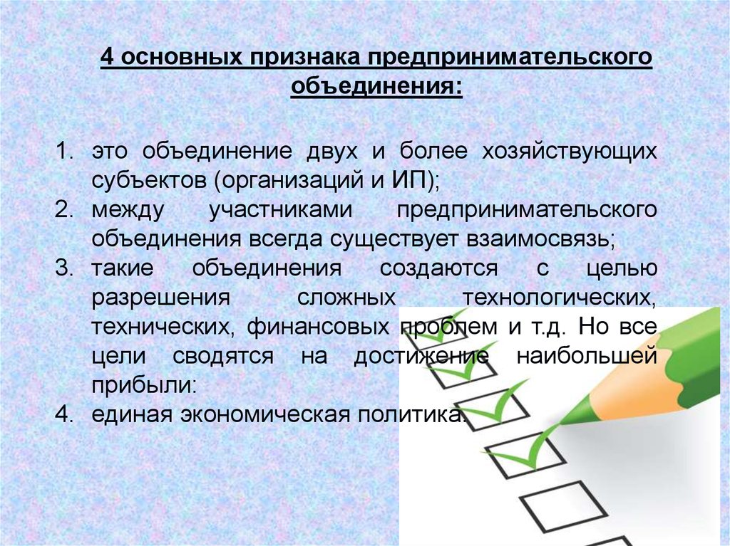 4 основных признака предпринимательскогообъединения: