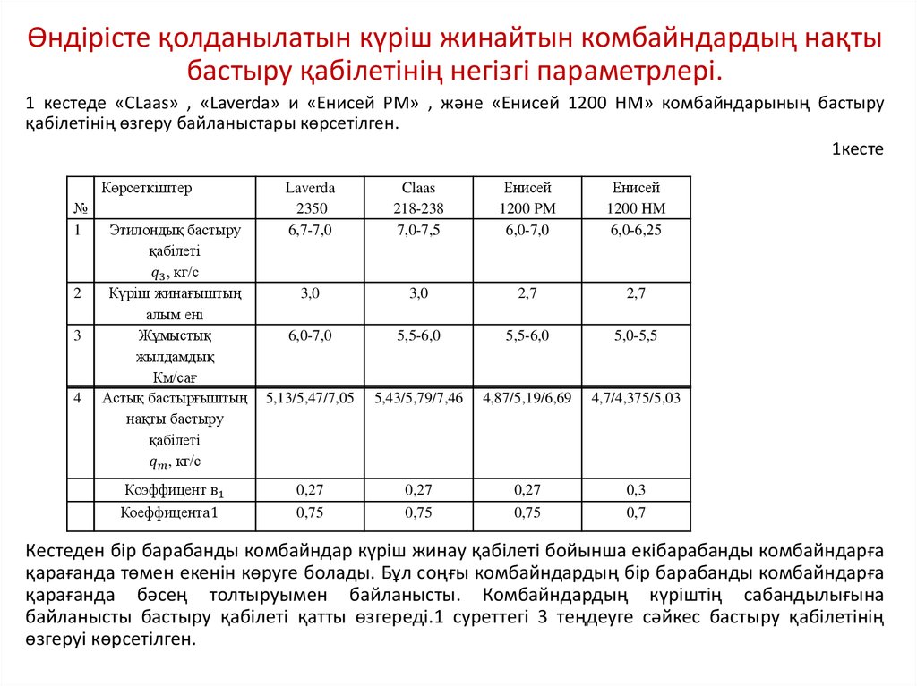 1. КҮРІШ ЖИНАЙТЫН ШЕТЕЛ КОМБАЙНДАРЫНЫҢ ӨТКІЗУ ҚАБІЛЕТІНІҢ ПАРМЕТРЛЕРІН ЗЕРТТЕУ