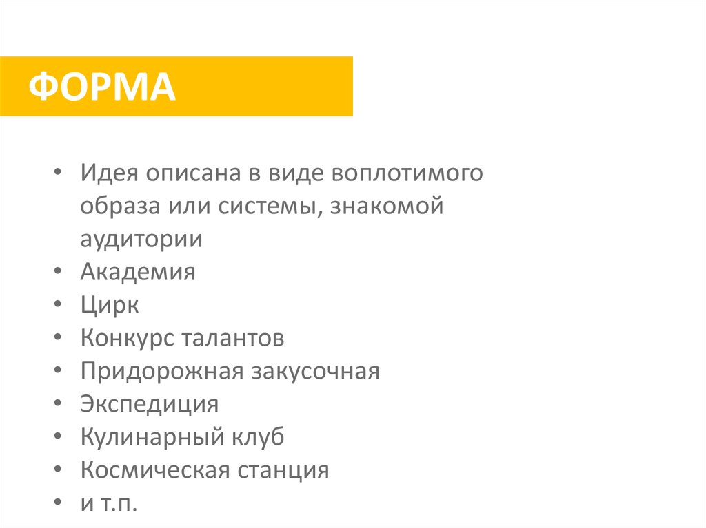 ФОРМА• Идея описана в виде воплотимого