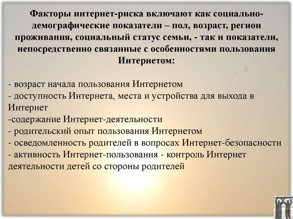 Факторы интернет-риска включают как социальнодемографические показатели – пол, возраст, регионпроживания, социальный статус семьи, - так и показатели,
