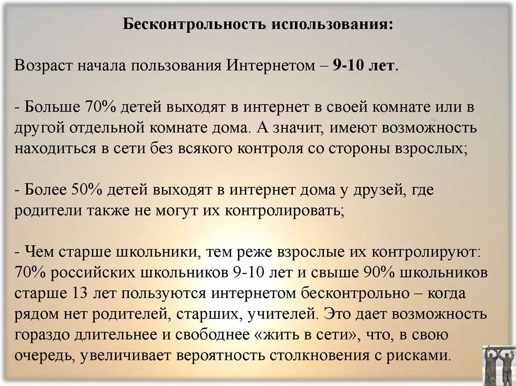 Бесконтрольность использования:Возраст начала пользования Интернетом – 9-10 лет.