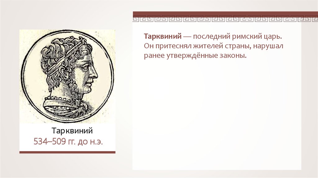 Тарквиний — последний римский царь.Он притеснял жителей страны, нарушал