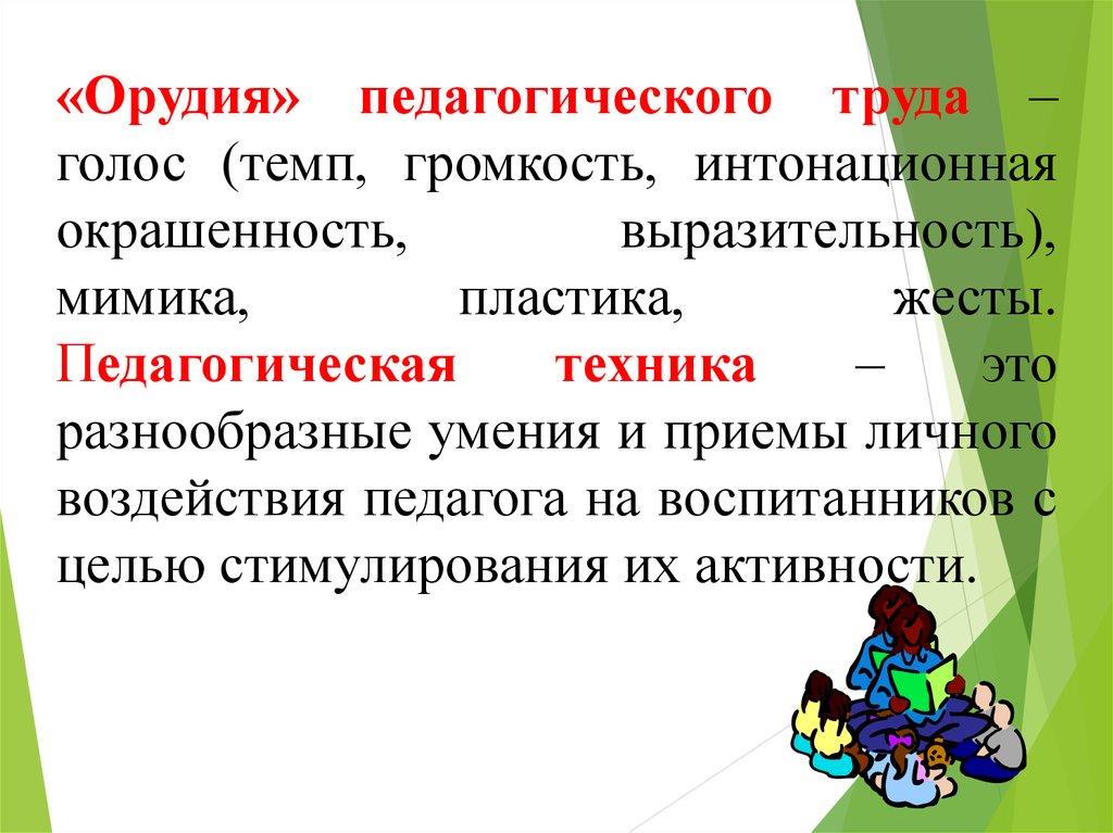 «Орудия» педагогического труда –голос (темп, громкость, интонационная