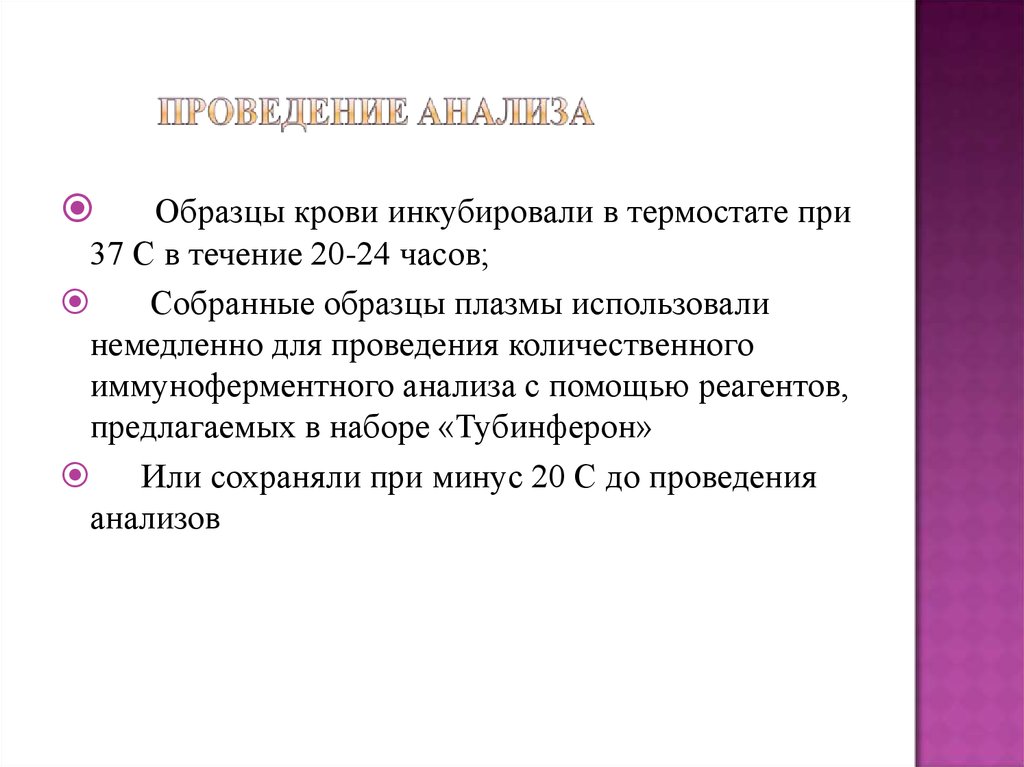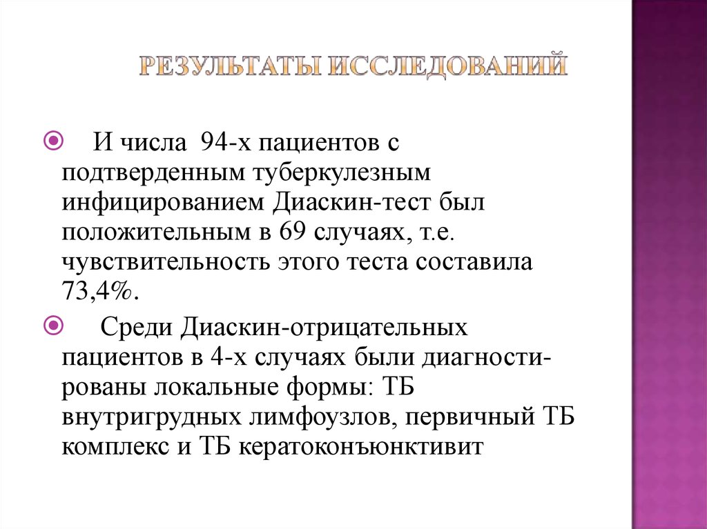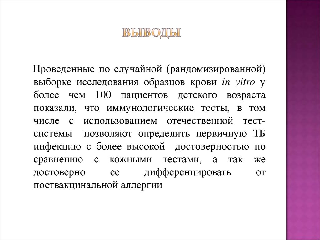методы: кожные тесты – р-ия Манту и Диаскин-тестобразцы крови: использовали отечественную тестсистему «Тубинферон» производства ООО «Мон-А»
