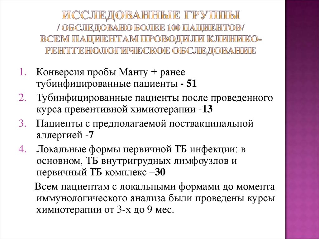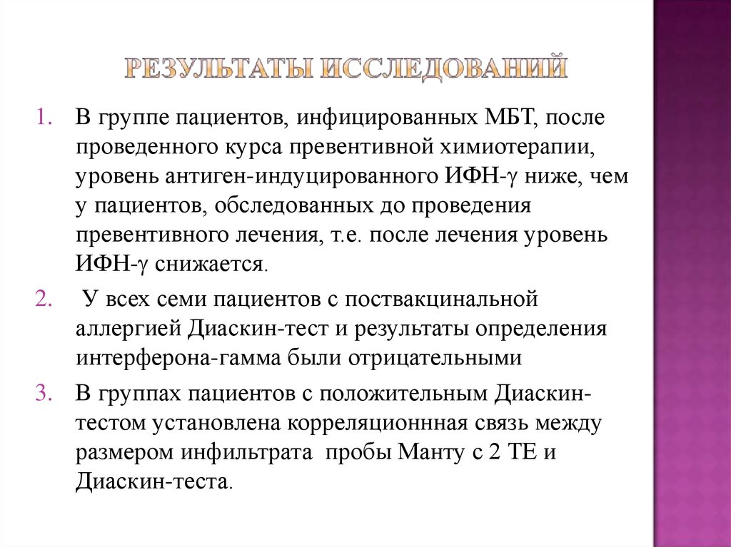 1. В группе пациентов, инфицированных МБТ, послепроведенного курса превентивной химиотерапии,