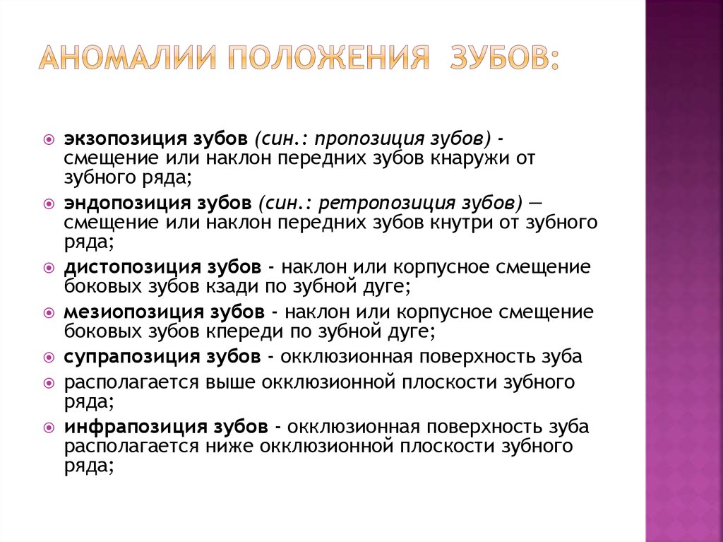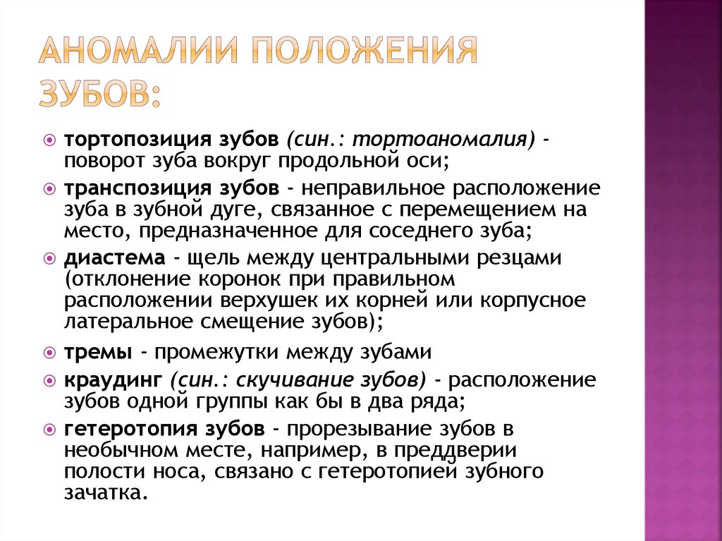 тортопозиция зубов (син.: тортоаномалия) поворот зуба вокруг продольной оси;транспозиция зубов - неправильное расположение