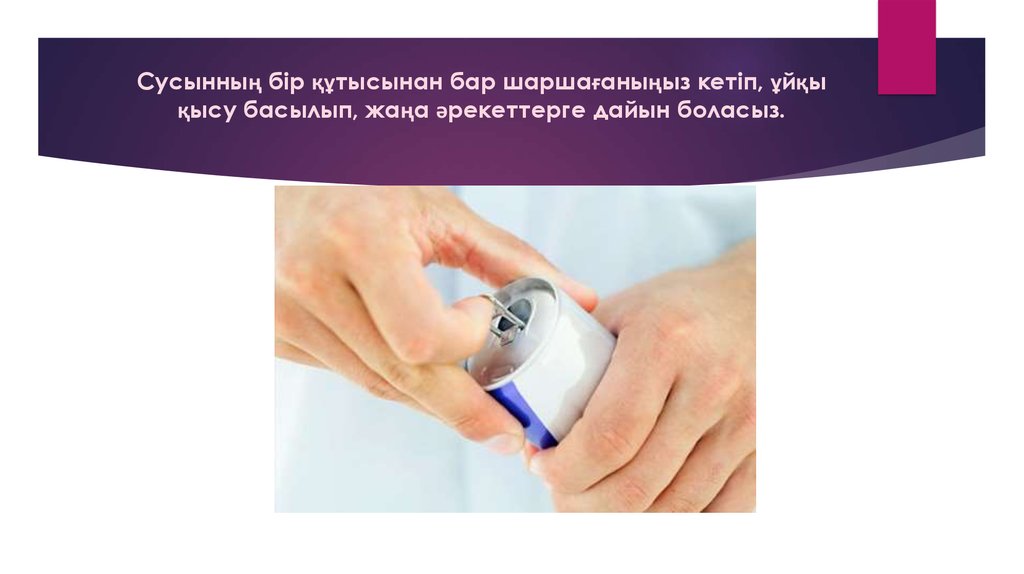 Сусынның бір құтысынан бар шаршағаныңыз кетіп, ұйқықысу басылып, жаңа әрекеттерге дайын боласыз.