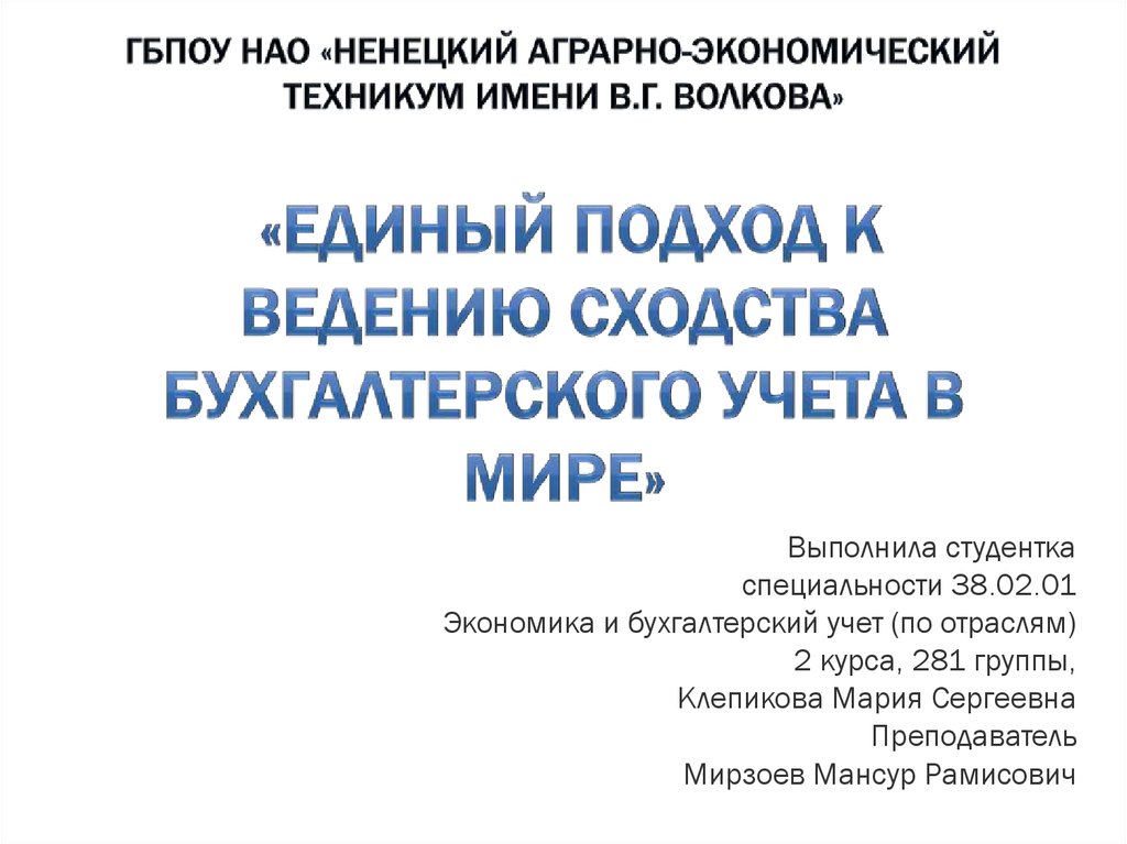 1. ГБПОУ НАО «Ненецкий аграрно-экономический техникум имени В.Г. Волкова» «Единый подход к ведению сходства бухгалтерского учета в мире»