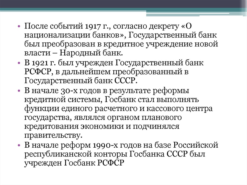 • После событий 1917 г., согласно декрету «Онационализации банков», Государственный банк