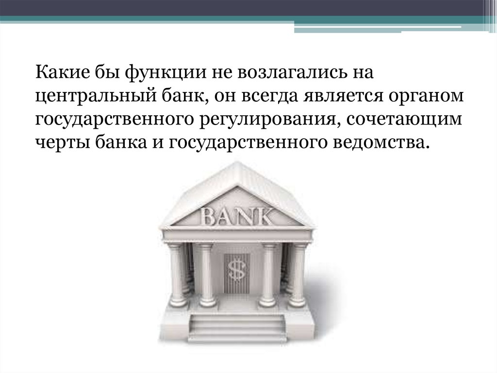 Какие бы функции не возлагались нацентральный банк, он всегда является органом