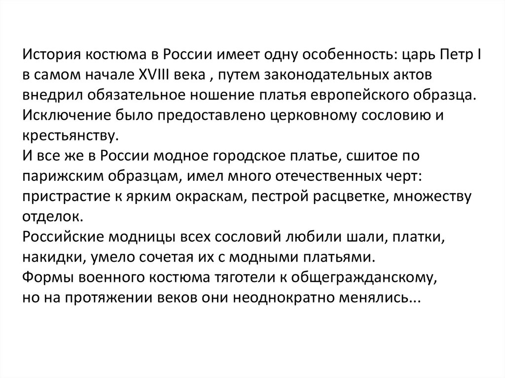 История костюма в России имеет одну особенность: царь Петр Iв самом начале XVIII века , путем законодательных актов