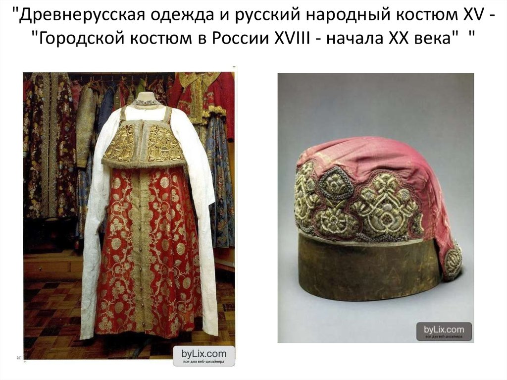 "Древнерусская одежда и русский народный костюм XV "Городской костюм в России XVIII - начала ХХ века" "4.