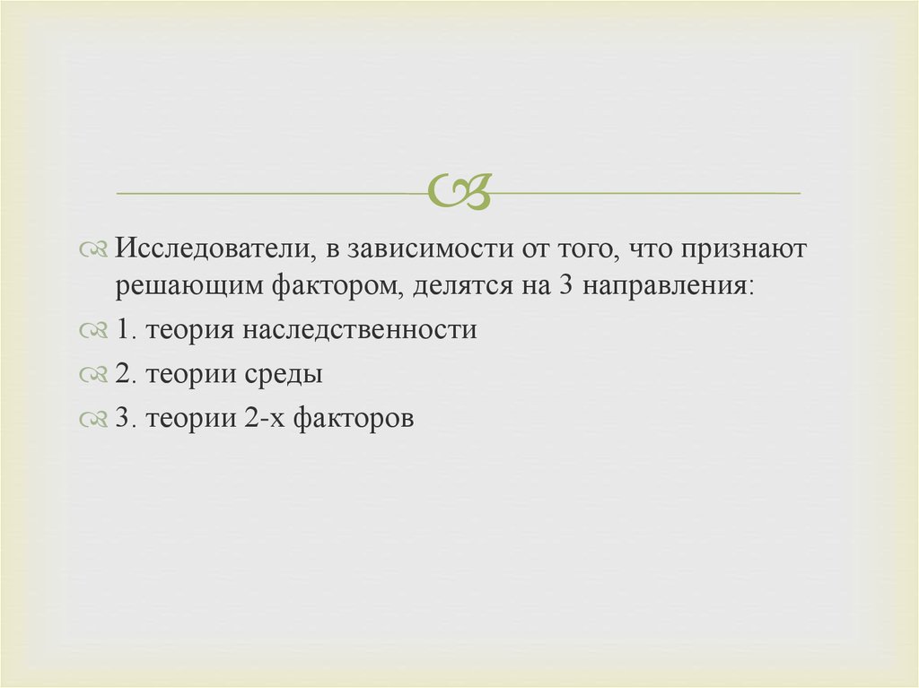 Исследователи, в зависимости от того, что признаютрешающим фактором, делятся на 3 направления:
